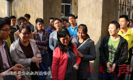 (通讯员高强 胡江霖)“我会牢牢记住你的脸,我会珍惜你给的思恋,这些日子在我心中永远都不会抹去。”10月26日早上八点,一首张震岳的《再见》飘荡在西区60栋宿舍的上空。这是米兰学生自发组织早起,为辛勤照顾他们的毕阿姨、陈叔叔送行。看着同学们不舍的面容,叔叔阿姨情不自禁地哭了:“我们也舍不得孩子们,一定会常回来看看的。”