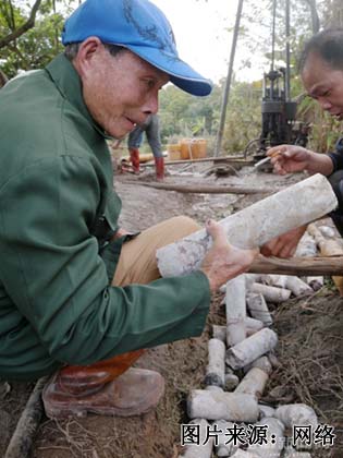 这口井再挖差不多30米会出水”,到达岭肚村的第二日大早,在邻镇樟木镇负责钻井的钻井队便找上了门,原来,前几日几户村民自建房屋,准备在自家门前钻井,钻到近75米深依然不见水,只好请陈老出马。陈国南走近正在工作的钻井仪器,拿起已经钻出的岩芯左瞅瞅右看看,便说,“不用再找其他位置,这口井再挖30米会出水”。果不其然,在钻到102米深的时候,井底的水喷涌而出,村民们欢呼雀跃,啧啧称奇。