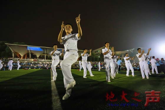 晚会在各营队嘹亮的歌声中拉开帷幕,《壮志飞扬》、《强军战歌》、《响当当的连队》……,新生们在教官的指挥下用如火的热情展现出他们激昂的斗志,最后,所有新生合唱校歌《勘探队员之歌》致敬学校。