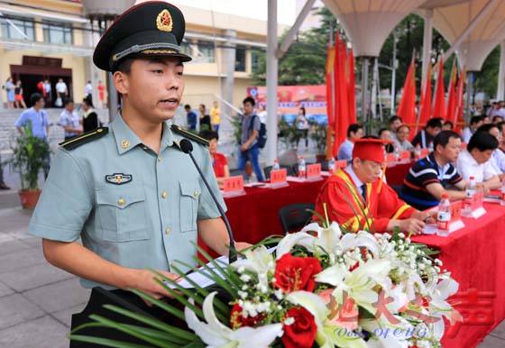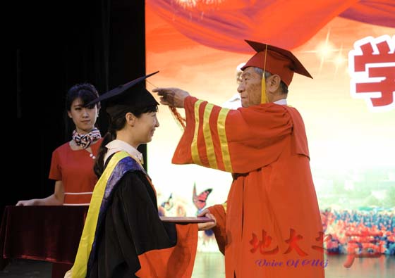 毕业生代表、工程学院的国防生史永斌发言。他说,大学四年的校园生活有哭有笑,离开时才发现自己深深的眷念着母校。以校训“艰苦朴素,求真务实”为核心的地大精神影响着每一个毕业生,他表示,必将用自己的实际行动来报答母校的培育。
