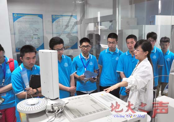 学生们跟随带队老师参观了生物与环境地质国家重点实验室和构造园。“这是ICP-AES仪器,运用电感耦合等离子矩为激发光源的光谱分析方法,具有准确度、精密度高可同时测定多种元素等优点”,正在实验室的博士生颜能为12名好奇的高中学生介绍道。中国大地构造模型、实物构造标本、典型构造掠影构造园的每一处无不吸引着这群学生的目光。“大地构造就像人体的骨骼一样……”彭松柏教授的讲解深入浅出,学生时不时隔着玻璃层触摸构造模型。