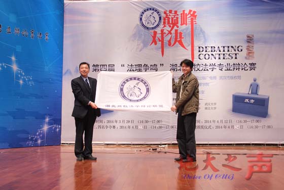 “湖北高校法学辩论联盟”本届盟主单位、米兰公共管理学院院长李江风和下一届盟主单位华中师范大学法学院党委书记李克武上台进行盟旗交接仪式。