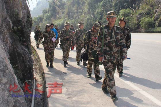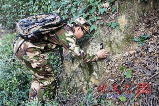 11月17日,记者随同野外实践教学中地质构造小组的老师和学员们,亲自体验了野外课堂中的苦与乐。清晨,搭载30多名学员的汽车从秭归出发,行进百余公里后来到长阳土家族自治县野外的公路边停下,开始一天里的野外课程学习。为了教学的安全,挎着医药箱、肩上标有醒目的红十字的军医也随同到来,此外,在学习区域的前后两头,分设安全路牌,派专人协调交通,一切组织有条不紊。在带队老师的要求下,学员们有的采集岩石标本、有的记录数据、有的手持放大镜观察岩石的特征成因。对于野外实践教学当中的每一处岩石教学点,他们都观察得极为认真,又同样认真操作着掌上GPS,谨慎地输入数据。学员于博兵认为,在野外采集地质数据,认真负责是关键,如果马马虎虎地分析岩石特性或者记录数据,那不仅违背科学精神,也违背自己的良心。在地质构造的知识点分析观察时,需要路过一小片农民的菜地,然而学员们都小心翼翼地往前挪步,生怕踩着了绿油油的白菜。这个小细节,让青年教师于洋非常感叹:他们不愧是人民的子弟兵,不愧是一支地质劲旅,这种过硬的政治素质和工作作风,值得所有的人学习!