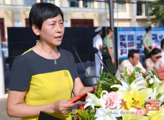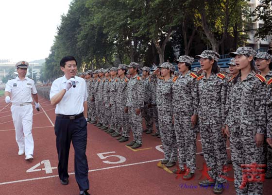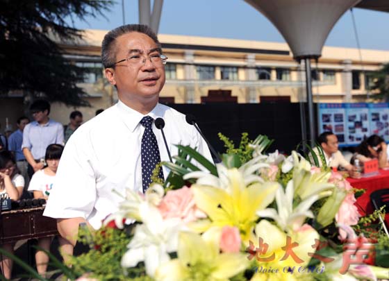 校长王焰新讲话。他首先向通过检阅的新地大人表示热烈的祝贺,并向全体官兵表示衷心的感谢。他说,中国现进入改革的“深水区”,要突破科技瓶颈,破解资源环境难题,推动产业升级,实现中国梦,就急需一大批勇于担当的创新人才。回首地大60余年的办学史,就是一部地大人勇于担当的历史。他相信,地大人这种勇于担当的精神也一定会融入新生们的血液,代代相传。他告诫新生们,勇于担当还需以能够担当为基础,大学的四年光阴,稍纵即逝,新生们要学会认识自己、自强自立,苦心研修、好学善问,坚守理想、知行合一。他强调,要成为“品德高尚,基础厚实,专业精深,知行合一”的新一代地大人,需时常提醒自己:我为何而来,又将载何而去?他说:“这是我的大学,也是你的大学。 我和你们的家长一样,心中会时刻牵挂着你们的所思、所为。我更热切地期待着:你们不辱使命,砥砺前行!”
