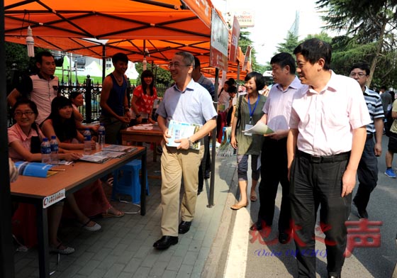 二、校党委书记郝翔、校长王焰新、校党委副书记傅安洲看望迎新工作人员。