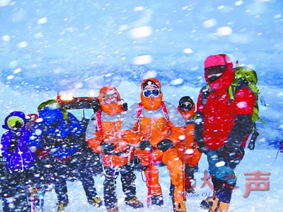 最大的困难是强风,风速超过每秒40米。“风一刮过来,我们就赶紧蹲下来,生怕被吹跑了。牛小洪老师更恐怖,因为只拿着雪杖,一起风他就趴在地上。”队员宋红说,“旁边就有一个女登山者,被风吹得滚出好几米,太危险了。”