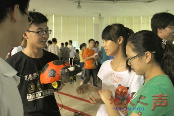 速度赛中,最快的小车只用了26.01秒,引起阵阵喝彩。外形比拼中,最引人注目的是D2组的“甲壳虫”机器人赛车,巨大的甲壳虫外形让观众眼前一亮。该组负责人李风建解释,机器人的外壳是由质量很轻的卫生纸巾做成的,速度和美观俱备。