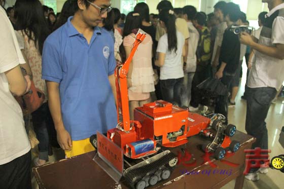 学子展示“甲壳虫”机器人赛车