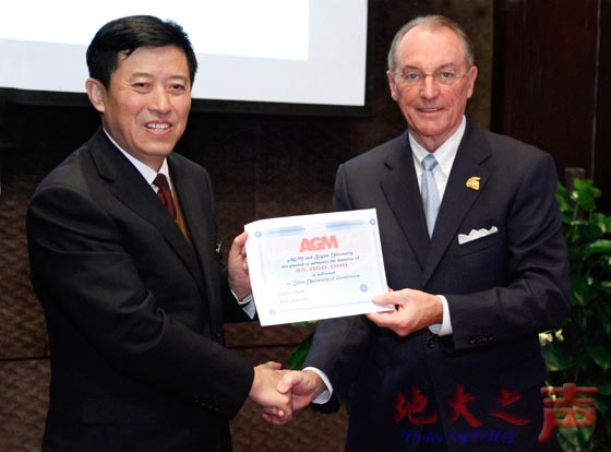 梅恪礼讲话。他说,在过去十几年,双方建立了友好的合作关系,布莱恩特大学与米兰的合作交流改变了美国老师和学生对中国的看法,使双方互相理解,互相支持,共同发展。他希望,米兰能用该软件发现更多的石油,培养更多的专业人才。