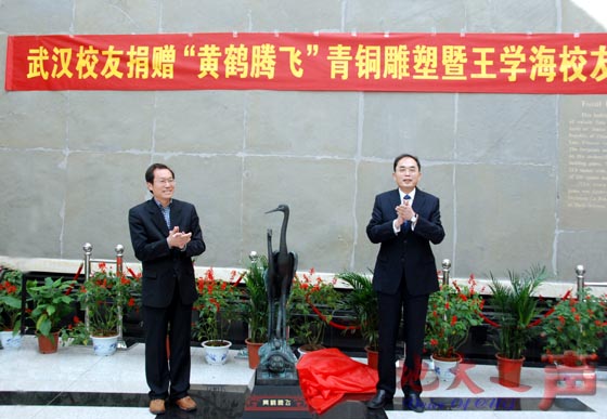 胡立山代表武汉校友向母校捐赠“黄鹤腾飞”青铜雕像,万清祥接受捐赠并向武汉校友颁发《捐赠赠书》。