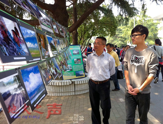 9月17日,“绿窗”爱心协会支教成果展举行。这次成果展记录了暑假期间“绿窗”通过“三下乡”社会实践活动,走进青海省民和回族土族自治县支教的点滴。图为校长王焰新和学生一起观看展览图片。(转自地大之声)