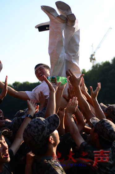 五、军训汇演暨开学典礼结束后,新生向辛勤执教的教官表示感谢。