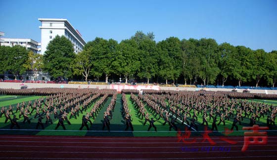 陈林根讲话。他说,广大新生在军训期间顽强拼搏、刻苦训练,树立了严明的纪律意识,养成了良好的团队精神,展示了地大学子追求卓越的精神面貌。他希望同学们继续发扬军训精神和地大精神,刻苦学习,早成栋梁。