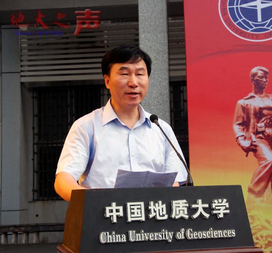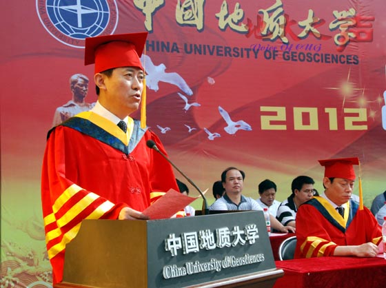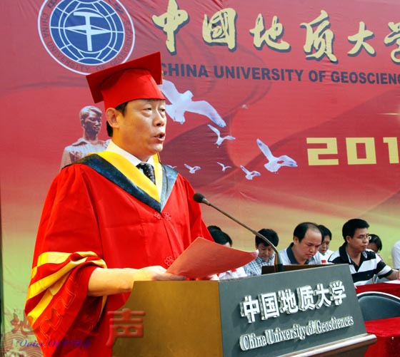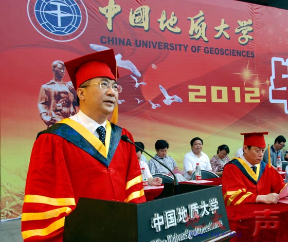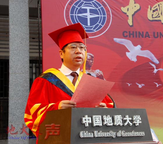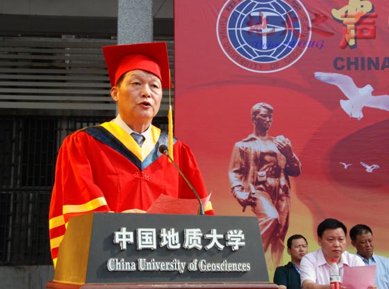 校长王焰新发表了题为《持家国情怀 担时代重任》的讲话。他代表学校向顺利完成学业的毕业生们致以最热烈的祝贺,并对他们提出深情厚望。他以温家宝总理、袁见齐院士等杰出校友的成长成才经历为例,阐述了地大人“心中持有家国情怀,敢于担当时代重任”这一光荣传统的丰富内涵,并勉励毕业生们向优秀校友学习,走好人生关键的起步,不计较工作负重与待遇,学会宽以待人、严于律己,把自己负责的每件小事做到最好,勇敢地把自己能挑的担子挑起来,怀一颗感恩的心,开始人生新的旅程;在日常工作和待人接物中,少一些短视、卑琐与私利,多一些胆略、豁达和大气;学会推功揽过,永远不要忘却甚至丢失自己的理想和热情,勇敢地去追寻和实现自己的理想。最后,他用一句话与同学们共勉:“我要用我自己工作的成绩来报答母校,决不辜负母校对我的期望,让母校永远记得他是一个优秀的学生! ”