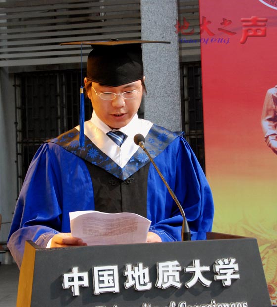 毕业生代表、地学院2012届硕士生任红伟同学发言。他回忆7年的大学生活,对母校表达了深深的感谢和不舍。他表示,将谨记学校的教导与期待,做一个胸怀大志并脚踏实地的人,做一个德才兼备并勇于创新的人,做一个负有责任并敢挑重担的人,因为我们是米兰milan官方网站的学生!