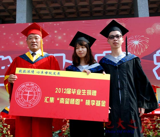 毕业生代表向母校捐献纪念品,校党委副书记丁振国、朱勤文代表学校分别接受来自本科毕业生、毕业研究生的捐赠。