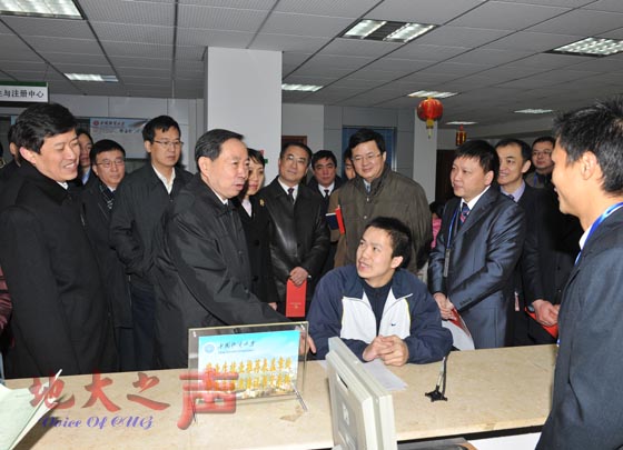 袁贵仁在西区学生服务大厅听取关于学生一站式服务的介绍,并与学生亲切交谈。