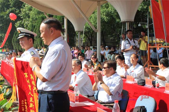 四、校党委副书记丁振国向海军工程大学船舶与动力学院赠送锦旗。