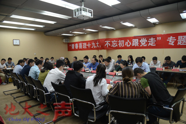 (地大之声通讯员姜明敏 赵薇 摄影庞伟红 付文泰)5月23日,“青春喜迎十九大,不忘初心跟党走”专题团会在大学生活动中心青年之家会议室举行。校党委书记何光彩、校党委副书记傅安洲,相关部门负责人、各学院(课部)团委书记、团员青年代表参加团会。与会人员集中观看学习了习近平总书记考察中国政法大学并发表重要讲话的新闻视频。