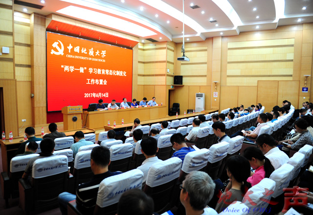 (地大之声记者刘妍慧 摄影张玉贤)6月14日,学校召开推进“两学一做”学习教育常态化制度化工作布置会,贯彻习近平总书记重要指示精神,按照湖北省委和教育部党组的要求,对学校推进“两学一做”学习教育常态化制度化工作做出具体安排。在校校领导,学校中层党员领导干部参加会议。会议由校党委副书记朱勤文主持。