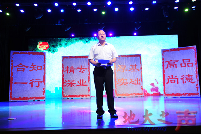 全体人员共同观看了《入团第一课》视频节选,回顾了中国共产主义青年团成立95周年以来的风雨历程和辉煌成就。在《共和国之恋》的歌声中,写有“品德高尚、基础厚实、专业精深、知行合一”的四个展板赫然出现在舞台上,来自大学生艺术团的同学们,展示了地大青年朝气蓬勃的形象,激情澎湃的情景朗诵博得台下的阵阵掌声。