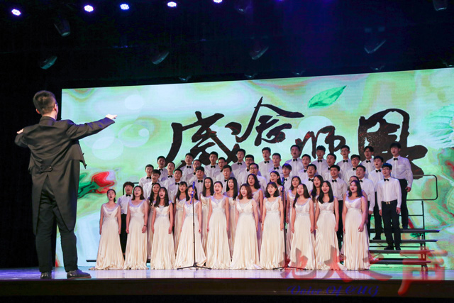 由研究生、本科生、留学生共同完成的地大版《成都》重温了母校的点点滴滴,追忆了毕业生们的青葱岁月,现场观众拿起手机打开闪光灯随着音乐挥舞,这一刻的弘毅堂宛若星空。校党委副书记傅安洲讲述了自己和母校的故事,并激情演唱《乌苏里船歌》。