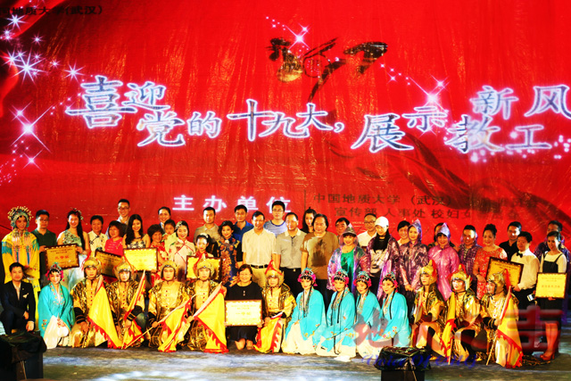 (地大之声通讯员杨茜 乔赫 摄影张昌荣 孟大维 屠傲凌)难忘的“风雨之夜”,特殊的“风采盛宴”,6月12日晚,“喜迎党的十九大,展示教工新风采”教职工风采大赛决赛在风雨中唯美收官。校领导何光彩、朱勤文、成金华、赖旭龙和相关职能部门负责人、各二级党组织书记、分工会及广大教职工数百人观看了比赛。