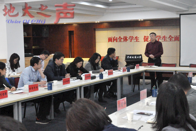 (地大之声通讯员 江丰伟)10月24日,学生工作处(部)、研究生工作部和校团委在师生交流厅组织学习党的十九大报告精神。副校长傅安洲,各学院(课部)党委(总支)副书记和学生工作处(部)全体人员参加会议。