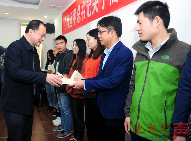 最后,党委书记何光彩为研究生辅导员代表、各培养单位研究生代表发放了《习近平总书记关于高等教育重要论述摘编》一书。