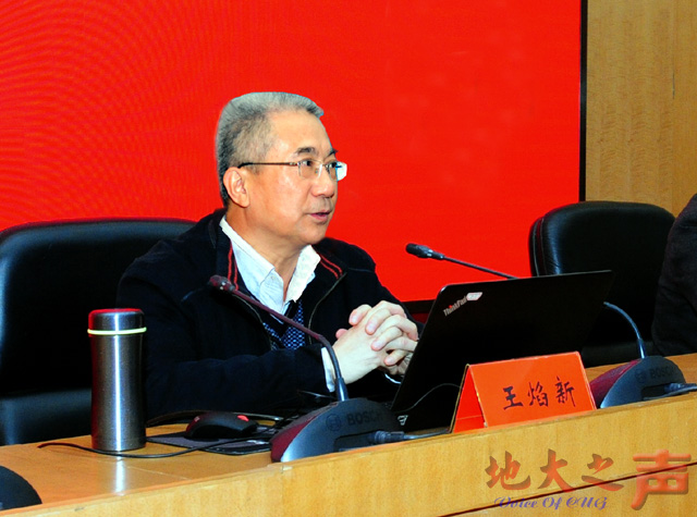 湖北省委宣讲团成员、校长王焰新以《学习贯彻党的十九大精神 建设地球科学领域世界一流大学》为题,作宣讲报告。宣讲紧紧围绕党的十九大报告,对党的十九大精神进行了全面系统解读。他指出,党的十九大报告的灵魂和主线是习近平新时代中国特色社会主义思想,并从新时代的特点和新时代中国共产党的历史使命、新思想的主要内容、开启新征程三个方面畅谈了个人的学习体会。他指出,五年来我们党推进历史性重大变革、取得历史性重大成就,最根本的就在于我们有以习近平同志为核心的党中央的坚强领导,有习近平新时代中国特色社会主义思想的科学指引。就如何理解把握新时代,他讲到,今天我们无限接近中华民族伟大复兴,科学社会主义焕发无限生机活力,我们为世界发展贡献了中国智慧。他强调,新时代中国共产党的历史使命,就是实现中华民族伟大复兴梦想,而实现伟大梦想,必须进行伟大斗争,建设伟大工程,推进伟大事业。他还就习近平新时代中国特色社会主义思想和基本方略,决胜全面建成小康社会、开启全面建设社会主义现代化国家新征程等方面进行了具体阐述。