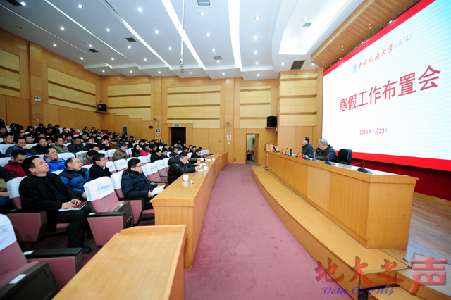 校长王焰新布置寒假工作。他说,2017年,学校首批进入国家“双一流”建设高校,基本实现了“地球科学一流、多学科协调发展”的阶段性办学目标,向研究型大学建设迈进。学校全面加强党的建设,深入落实立德树人根本任务,大力推进学科建设、师资队伍建设、科技工作,大力提升社会服务能力,着力加强国际交流与合作,着力推进校园文化建设,着力提升服务保障能力,学校的综合实力和办学水平不断提高,这是全校师生共同努力的成果。