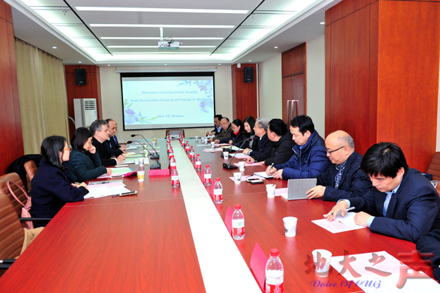 (地大之声通讯员宫斯宁 张立军)3月19 日下午,法国驻武汉总领事贵永华先生一行来米兰访问。校长王焰新、副校长赖旭龙接见了来访客人。教务处、科学技术发展院、环境学院、经济管理学院、珠宝学院、国际教育学院负责人和教师代表参加会谈。
