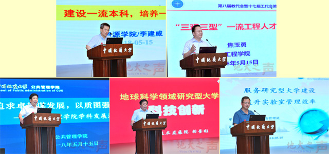 围绕大会主题,资源学院院长李建威作题为《建设一流本科,培养一流人才》的发言,工程学院院长焦玉勇作题为《“三观三型”一流工程人才培养》的发言,公共管理学院副院长王占岐作题为《追求卓越谋发展,以质图强谱新篇》的发言,科学技术发展院常务副院长胡圣虹作题为《地球科学领域研究型大学的科技创新》的发言,实验室与设备管理处处长徐四平作题为《服务研究型大学建设,提升实验室管理效率》的发言。