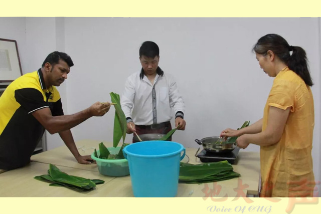 雪白的糯米、油绿的粽叶、五彩的棉线,还有各色馅料,在老师们的巧手下变成了一个个棱角分明、精致饱满的粽子。国际学生在老师的指导下,依葫芦画瓢,顺利地完成了自己人生中的第一枚粽子。“说起端午节,还得从战国时期的爱国诗人屈原说起……”,在包粽子之余,老师们向国际学生讲起了端午节的来源和故事。屈原投江、赛龙舟、悬艾叶、佩香囊……一个个故事和习俗令同学们听得入神,在与老师的亲切交流和包粽子的切身体验中感受着端午节的意义。期间,巴基斯坦1班学生为师生们演唱了一首《三字经》,用歌声表达了对中国文化的喜爱。最后,老教师、国际教育学院负责人与国际学生们一同品尝了大家的“作品”,并为同学们送上了端午节的祝福。