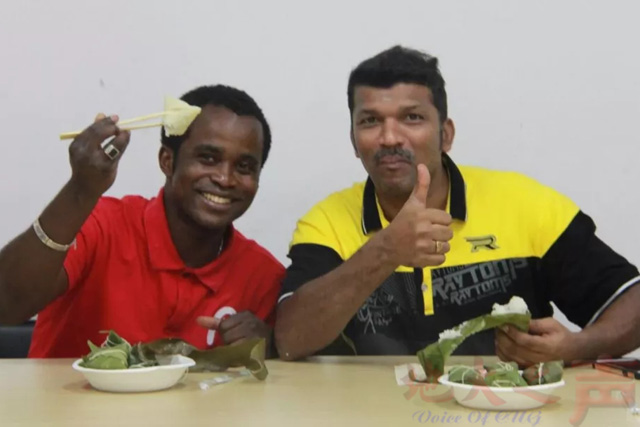 来自刚果(布)的赛特和来自马来西亚的陈达辉开心地品尝着自己的劳动成果,给自己点个赞!