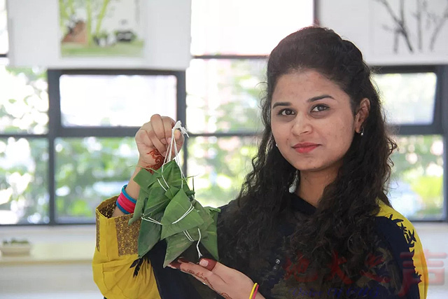来自斯里兰卡的nisha展示自己的第一颗粽子,她觉得自己包的不好,还有点不好意思呢。