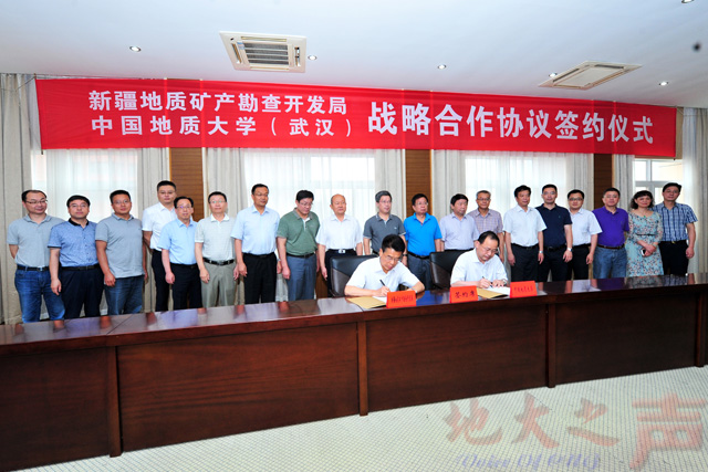 刘颂东与何光彩签署局校战略合作协议。根据协议,局校双方将在人才培养、科技合作等方面开展全面深入合作,围绕新疆自治区地质矿产勘查、固体矿业资源勘查与开发、地质环境监测与保护,非常规能源勘查与开发等领域,共建产、学、研、用创新科研平台。