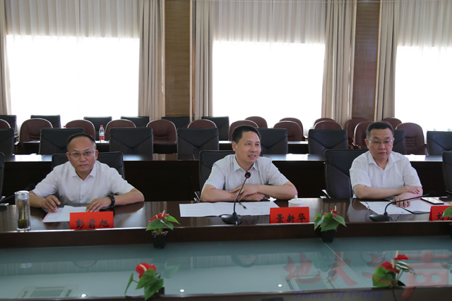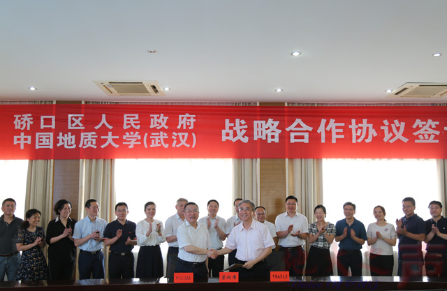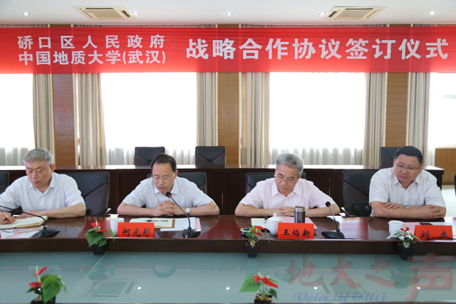 (地大之声记者徐燕 通讯员杨贵仙)7月3日,武汉市硚口区委书记景新华、区长刘丹平一行来校访问交流,并签署区校战略合作协议。硚口区委常委、组织部长彭前旭、副区长张智,区科技局、招才局、人资局、经信局、环保局负责人,党委书记何光彩、校长王焰新、副校长傅安洲、刘杰,环境学院李义连教授及学校相关部门、学院负责人参加座谈交流。傅安洲主持会议。