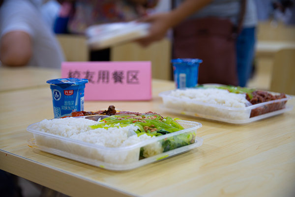 随后,校友们在爱校联合会志愿者和地子归社团志愿者的引领下,走入学三食堂,品尝学校精心准备的“爱校团圆餐”。