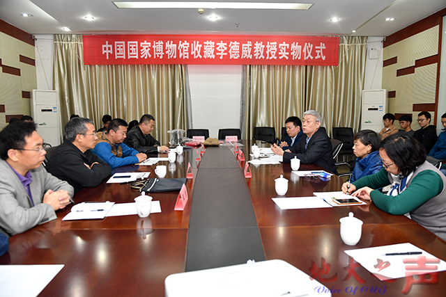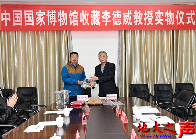 (地大之声记者徐燕 摄影张玉贤)10月16日,中国国家博物馆收藏李德威教授实物仪式在迎宾楼三号会议室举行。中国国家博物馆征集与鉴定部馆员吴华良,副校长傅安洲,李德威教授妻子、武汉大学人民医院夏芳教授,相关单位负责人和师生参加。党委宣传部部长胡守庚主持仪式。