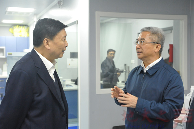 在生物地质与环境地质国家重点实验室,姜大明一行考察了实验室环境科学分析仪器平台,实验室专职副主任祁士华教授介绍了实验室在科学研究、人才培养、团队建设等方面的进展和成绩,以及实验室在地球表生作用研究方面取得的标志性成果。姜大明表示,地大发挥学科专业优势,紧紧围绕美丽中国建设和生态文明建设,在山水林田湖草海生命共同体等领域,取得一系列创新性研究成果,对当前的国家自然资源调查和生态环境保护具有一定的指导意义。
