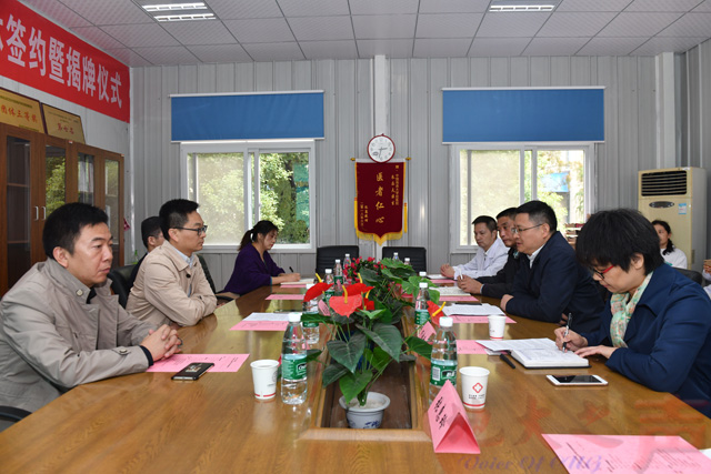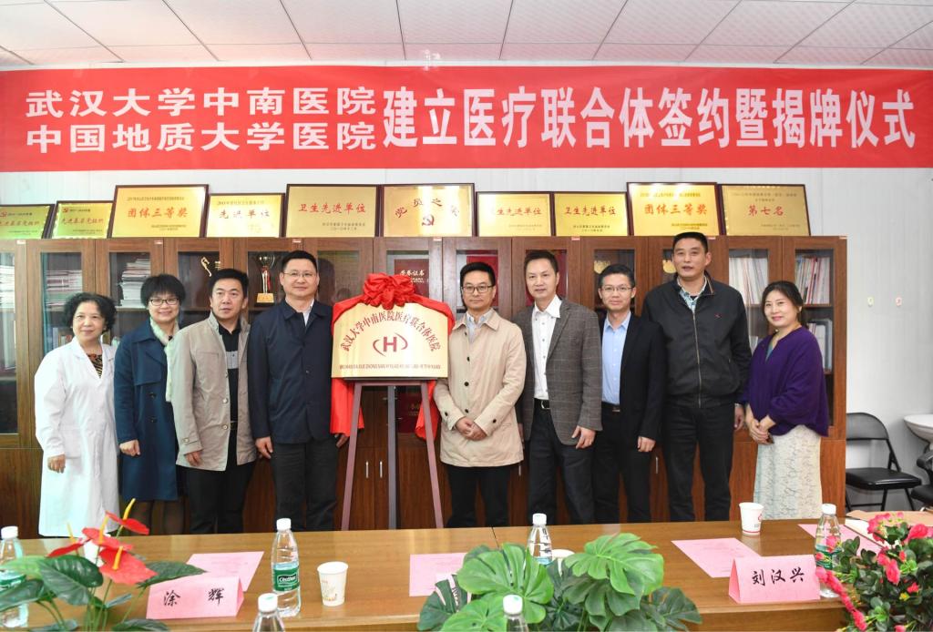 (地大之声通讯员徐祝心 摄影张玉贤)10月22日,校医院与武汉大学中南医院医疗联合体签约暨揭牌仪式在医院会议室举行。中南医院副院长李志强、社会医疗发展部部长梅斌,副校长刘杰,校医院院长何晓玲、党总支书记马彦周,双方医院相关科室负责人参加签约暨揭牌仪式。