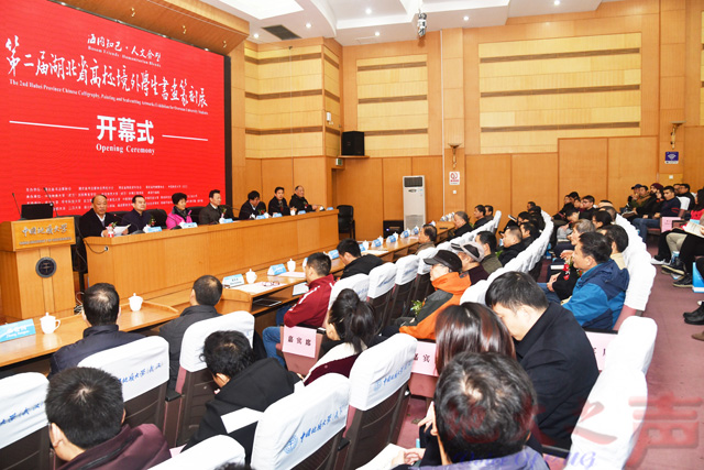 湖北省书法家协会高校分会主席、湖北省老教授协会副会长、湖北高校老年协会副会长丁振国主持开幕式。湖北省国际文化交流中心理事长、湖北省人大常委会原副主任赵斌宣布展览开幕。