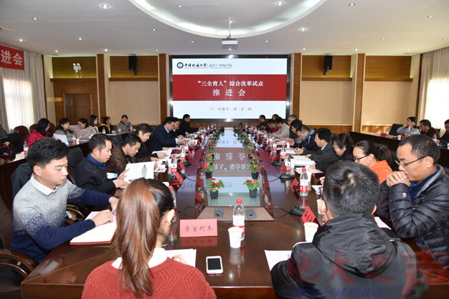 (地大之声通讯员李平 张学海 汪静)11月22日,环境学院在惠宾楼四层会议室召开“三全育人”综合改革试点工作推进会。副校长刘杰,相关部门负责人,环境学院党政班子成员、各系室主任、师生党支部书记、院工会院团委学生会等负责人、师生代表等参加了推进会。学院党委书记李素矿主持推进会。