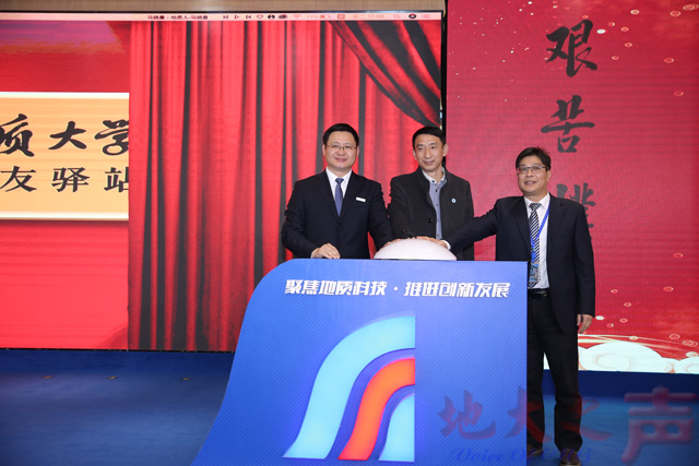 副校长刘杰、浙江省第一地质大队党委书记江根耀、浙江校友分会会长丁晓冬共同为华东校友驿站揭牌。