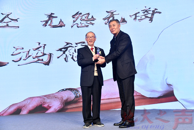 凤凰卫视常务副行政总裁、凤凰教育董事长崔强为殷鸿福院士颁奖。