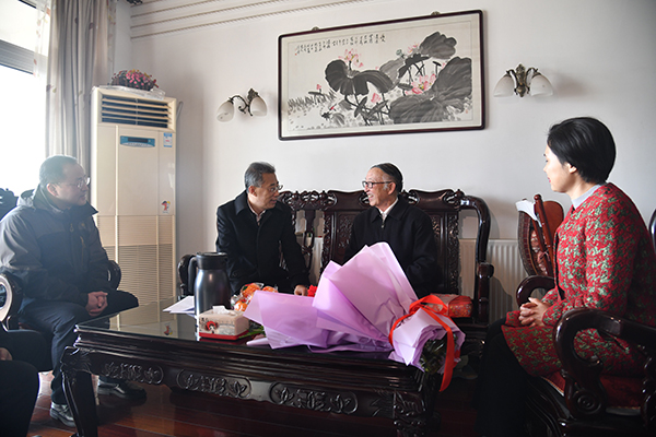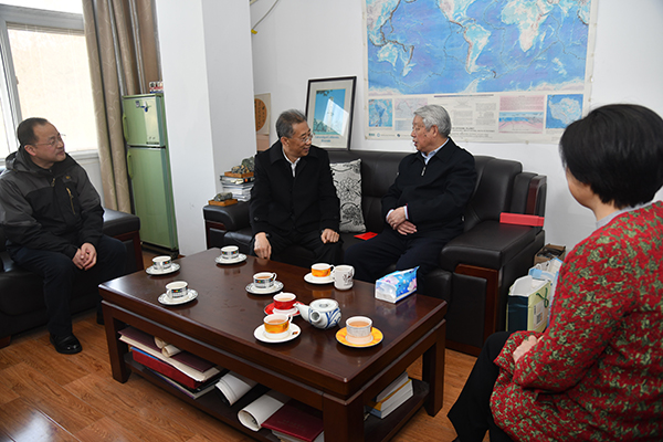 (地大之声记者徐燕 摄影张玉贤)1月24日下午,省委常委、组织部部长王瑞连来校看望慰问殷鸿福、金振民两位院士,向他们潜心教书育人、勇攀科学高峰,为湖北教育事业及经济社会发展贡献智慧力量表示衷心感谢,向他们致以新春祝福。省委组织部部务委员周志红,校党委书记何光彩、党委副书记唐辉明、校长助理周爱国等参加看望慰问。