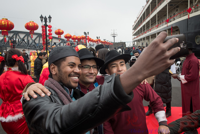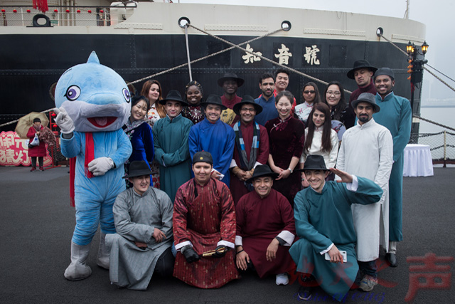 夜幕降临,霓虹的灯光映射江面上,国际学生们集体穿上中国的传统服装,登上知音号,观赏《知音号》演出,跟着演员一起“穿越”到上世纪的老武汉。