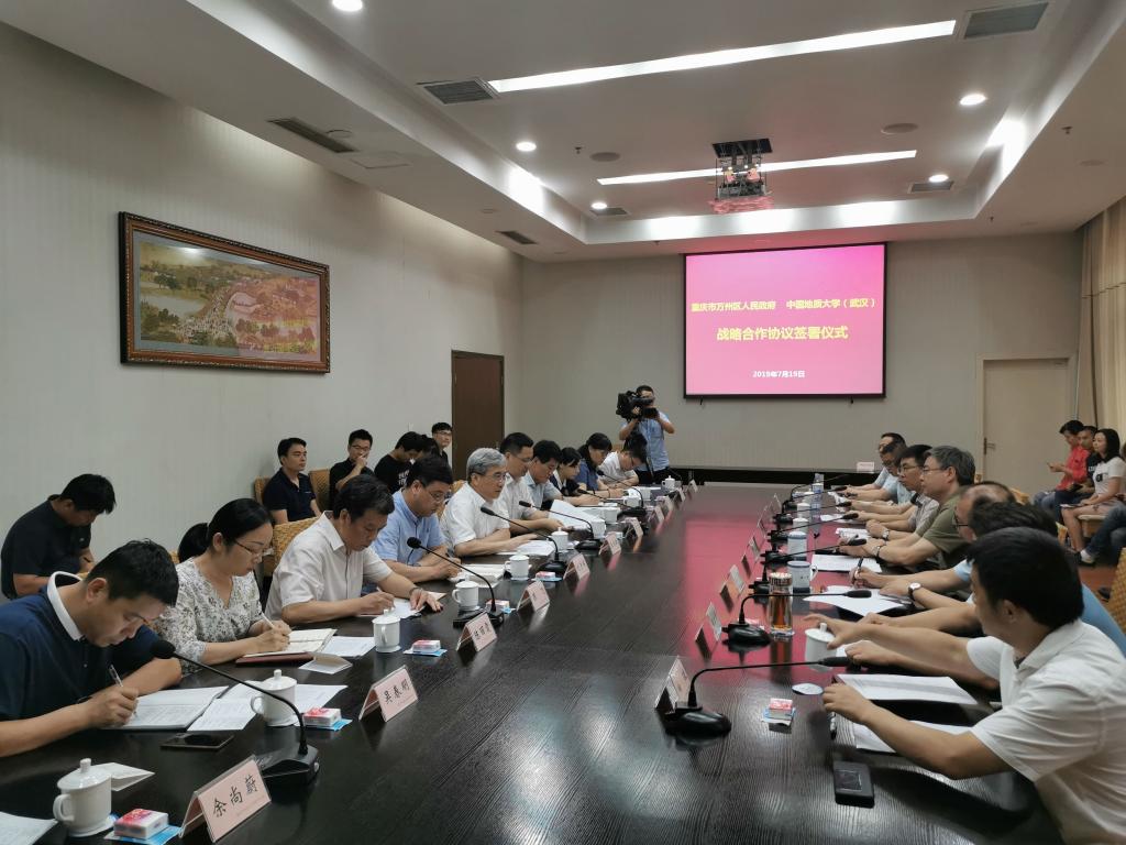 王焰新校长介绍了学校发展情况,回顾了学校与重庆市及万州区长期稳定合作的历程,对万州区委、区政府一直以来重视、支持和推动与地大的全方位合作表示感谢。他表示,要认真贯彻落实习近平总书记关于加强自然灾害防治的重要指示,建立高效科学的自然灾害防治体系,提高自然灾害防治能力,切实保障人民群众生命财产安全和社会经济高质量发展。他指出,万州区位优势突出、高等教育基础较好、自然资源丰富,学校将全面落实与重庆市人民政府战略合作协议及区校战略合作协议,充分发挥学科、科技、人才、平台等综合优势,在人才培养、科技创新、生态文明建设、地质灾害防治、自然资源保护和利用、科技成果转化等领域与万州开展全面深入的合作,为万州经济社会高质量发展提供人才、技术与智力支撑,助力万州加快建设“产业生态化、生态产业化”先行示范区。