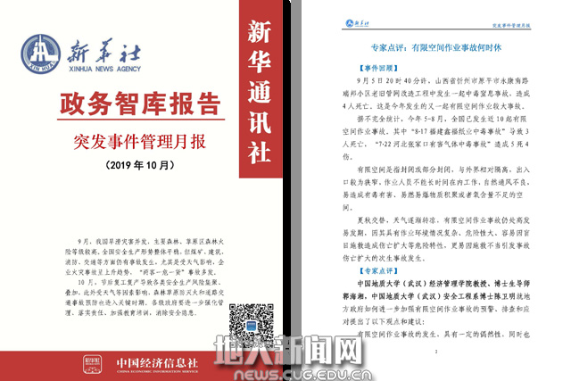 地大新闻网讯(通讯员胡燕)近日获悉,新华社《政务智库报告.突发事件管理月报》(2019年10月)刊发了米兰经济管理学院郭海湘教授、安全工程系陈卫明博士撰写的文章《专家点评:有限空间作业事故何时休》。文章提出,为了避免和防范有限空间作业事故的发生,需要全社会的共同努力,从完善政府安全监管机制,引入安全生产责任保险、严格落实企业主体责任制度,健全企业安全管理制度和运用现代新型技术,强化应急管理创新等多方面来遏制事故的频繁发生。